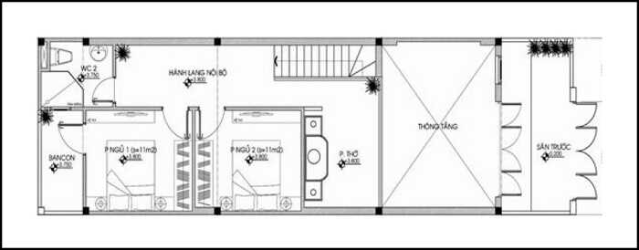 Tầng 2 gác lửng thiết kế 1 phòng thờ, 2 phòng ngủ và 1 phòng vệ sinh chung phía sau và khoảng thông tầng phía trước. Trong đó phòng ngủ phía sau có ban công hóng gió mát. Với cách bố trí công năng sử dụng khoa học và hiện đại giúp chủ đầu tư tiết kiệm diện tích đất xây dựng, các không gian sinh hoạt không chồng chéo lên nhau gây bí bách cho ngôi nhà.